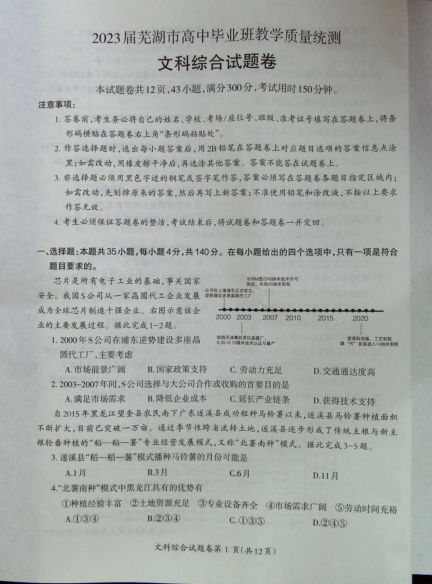 安徽省芜湖市2023届高三下学期5月教学质量统测 文综