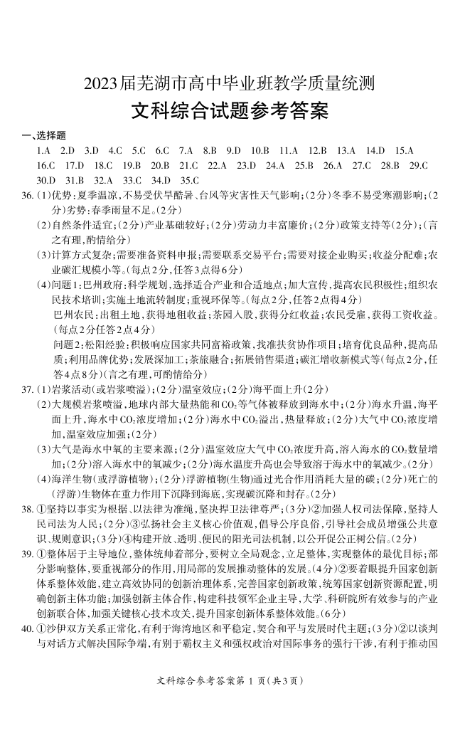 安徽省芜湖市2023届高三下学期5月教学质量统测 文综答案