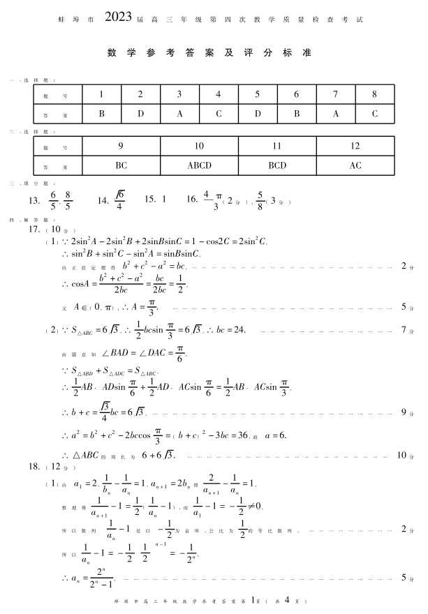 安徽省蚌埠市2023届高三第四次教学质量检查考试 数学答案