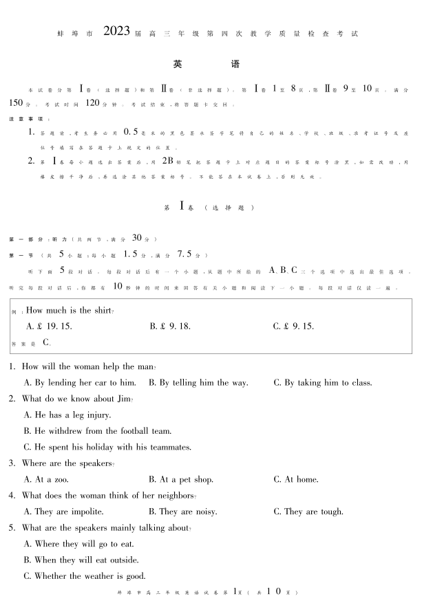 安徽省蚌埠市2023届高三第四次教学质量检查考试 英语