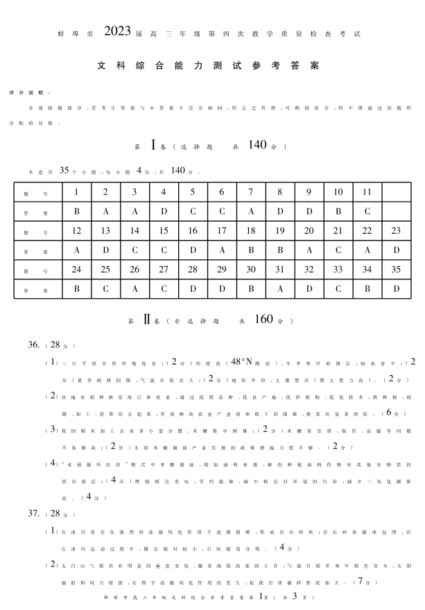 安徽省蚌埠市2023届高三第四次教学质量检查考试 文综答案