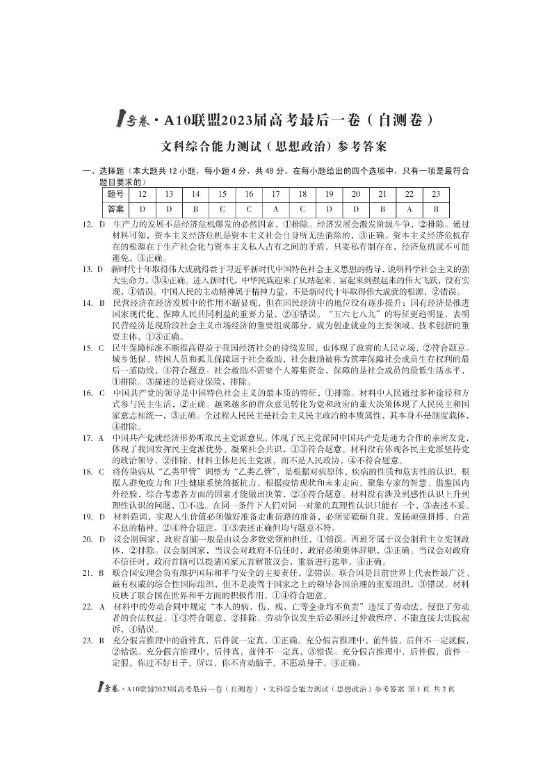 2023安徽A10联盟最后一卷 文综答案