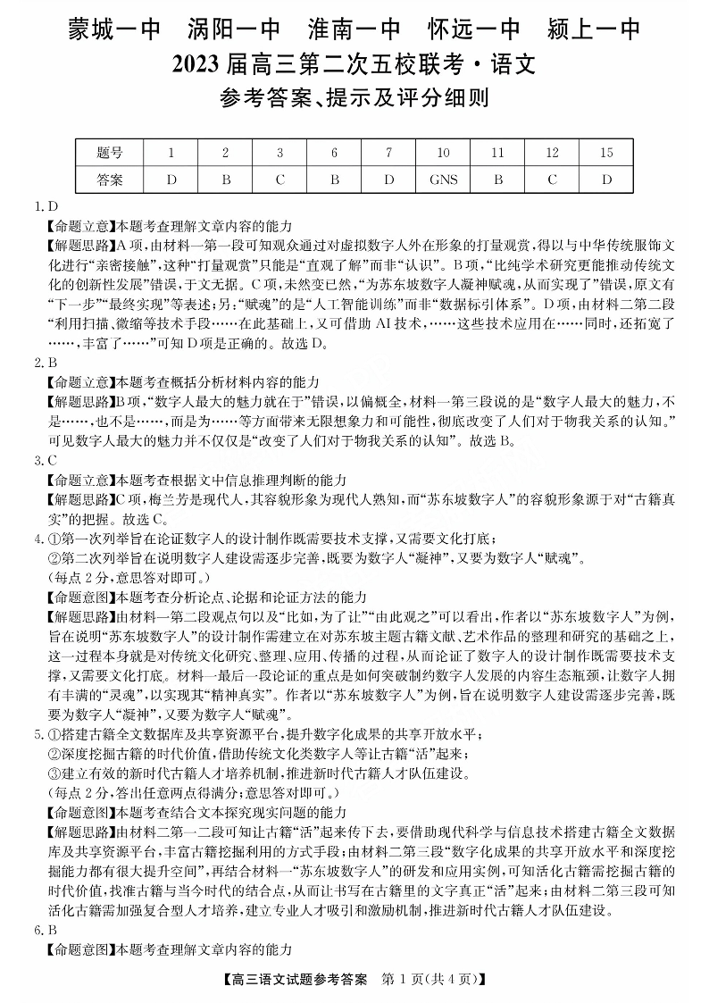 安徽2023届五校第二次联考 语文答案