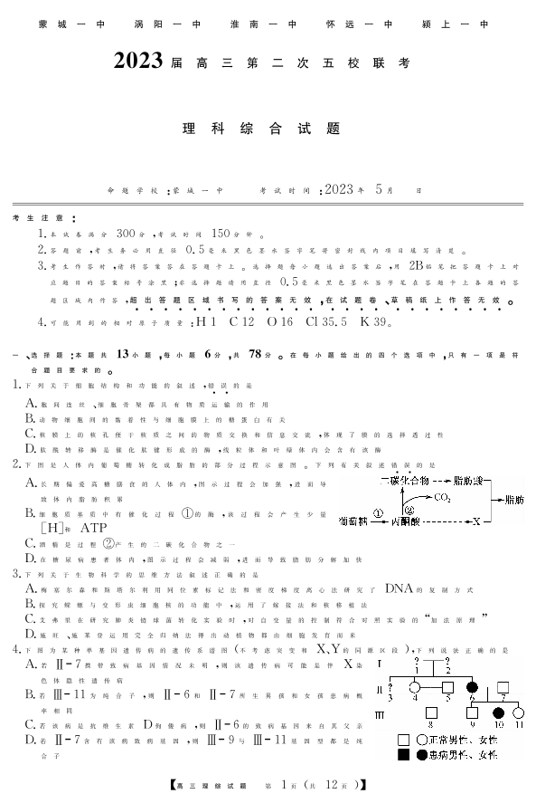 安徽2023届五校第二次联考 理综