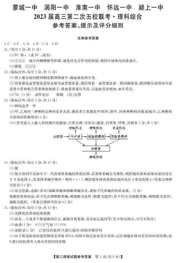 安徽2023届五校第二次联考 理综答案