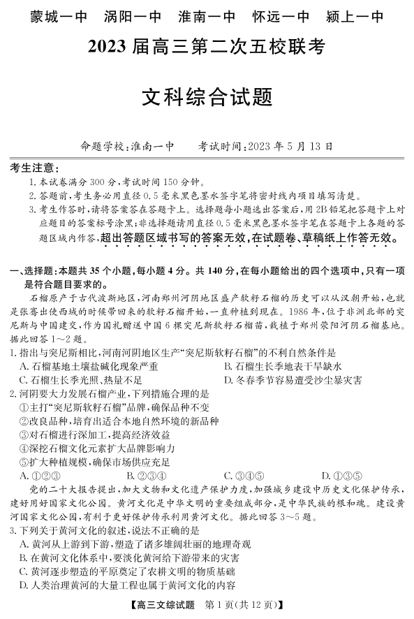 安徽2023届五校第二次联考 文综