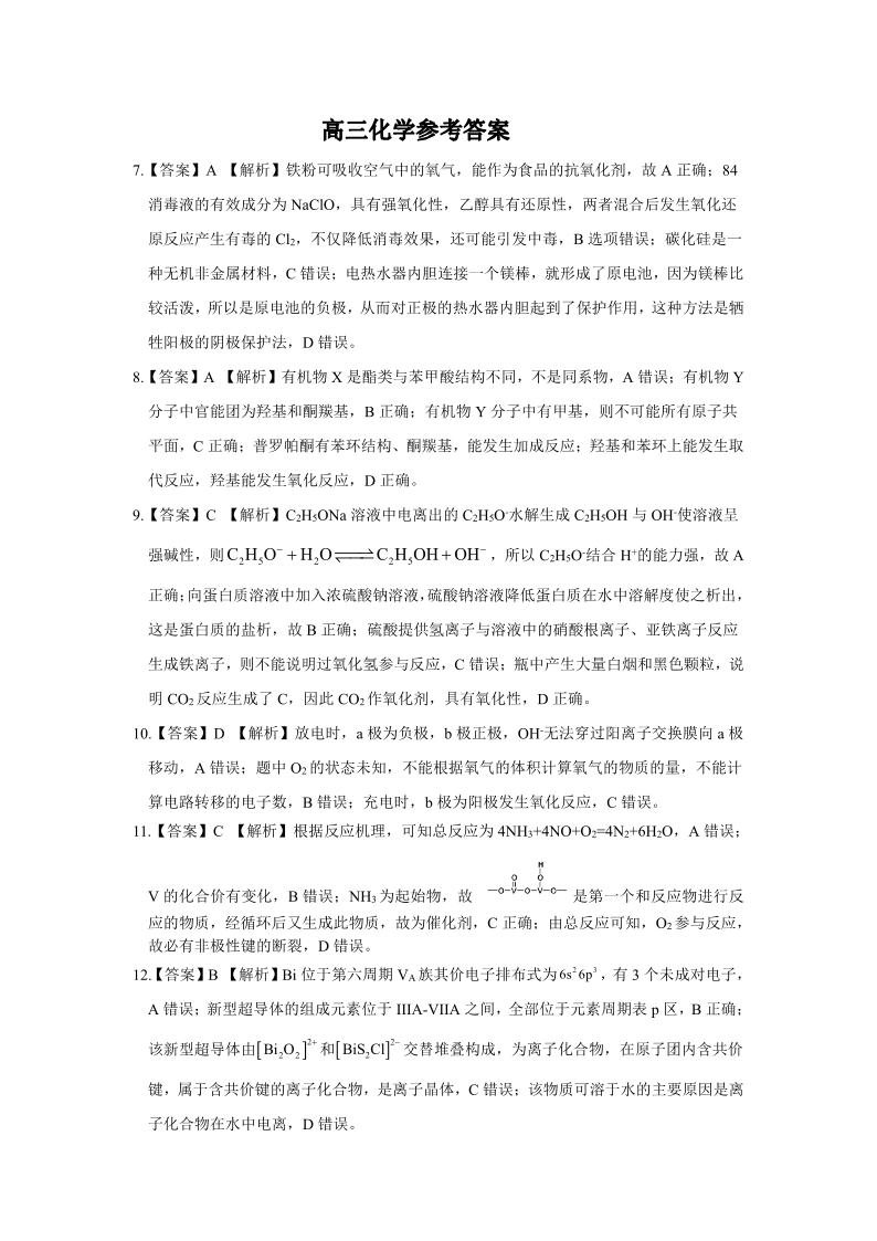 2023届安徽省皖江名校联盟高三最后一卷 理综化学答案