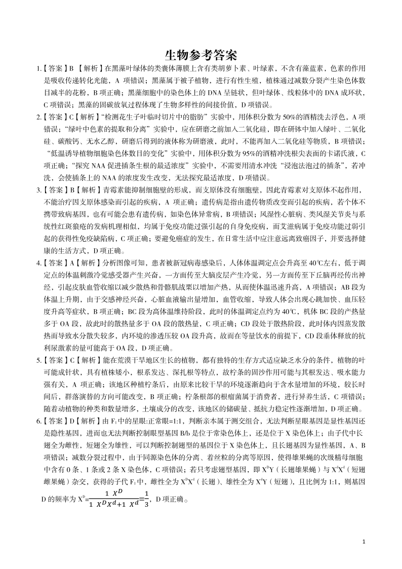 2023届安徽省皖江名校联盟高三最后一卷 理综生物答案
