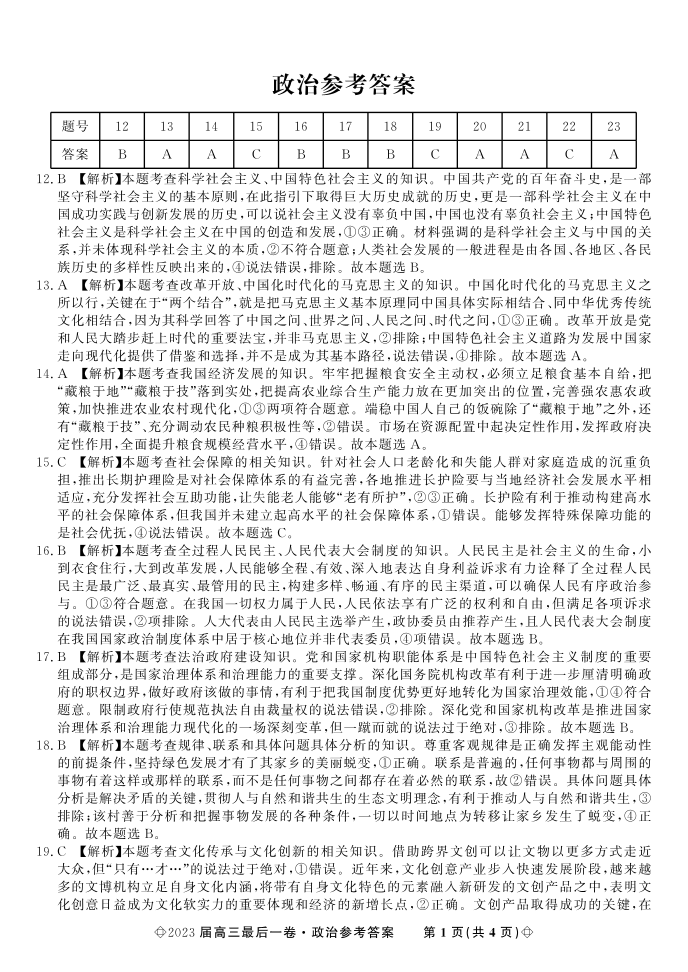 2023届安徽省皖江名校联盟高三最后一卷 文综政治答案