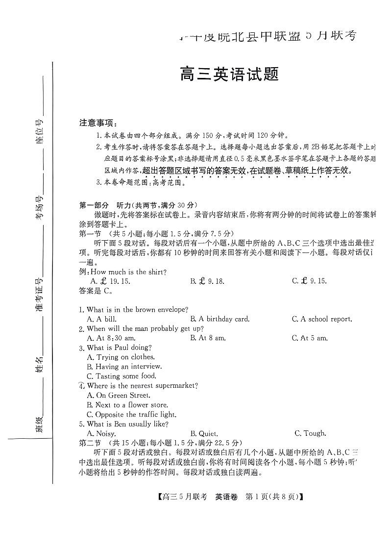 安徽省2022-2023学年度皖北县中联盟5月联考 英语