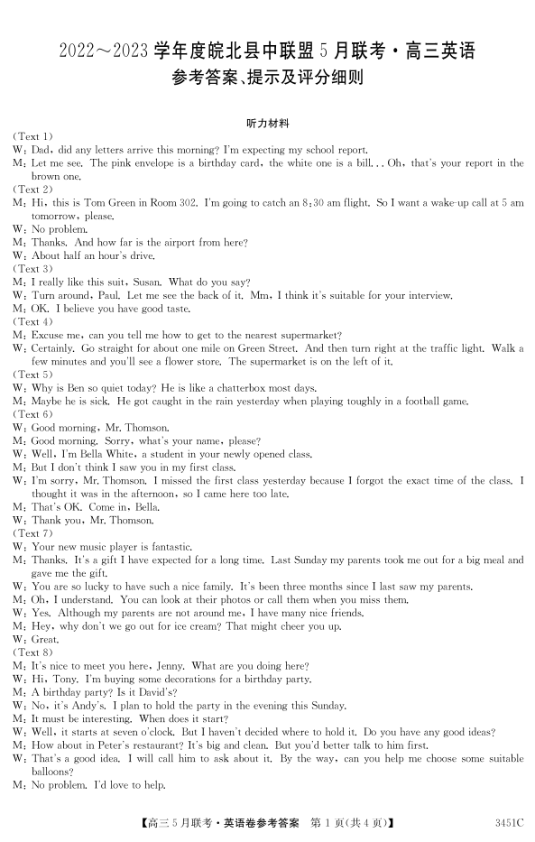 安徽省2022-2023学年度皖北县中联盟5月联考 英语答案