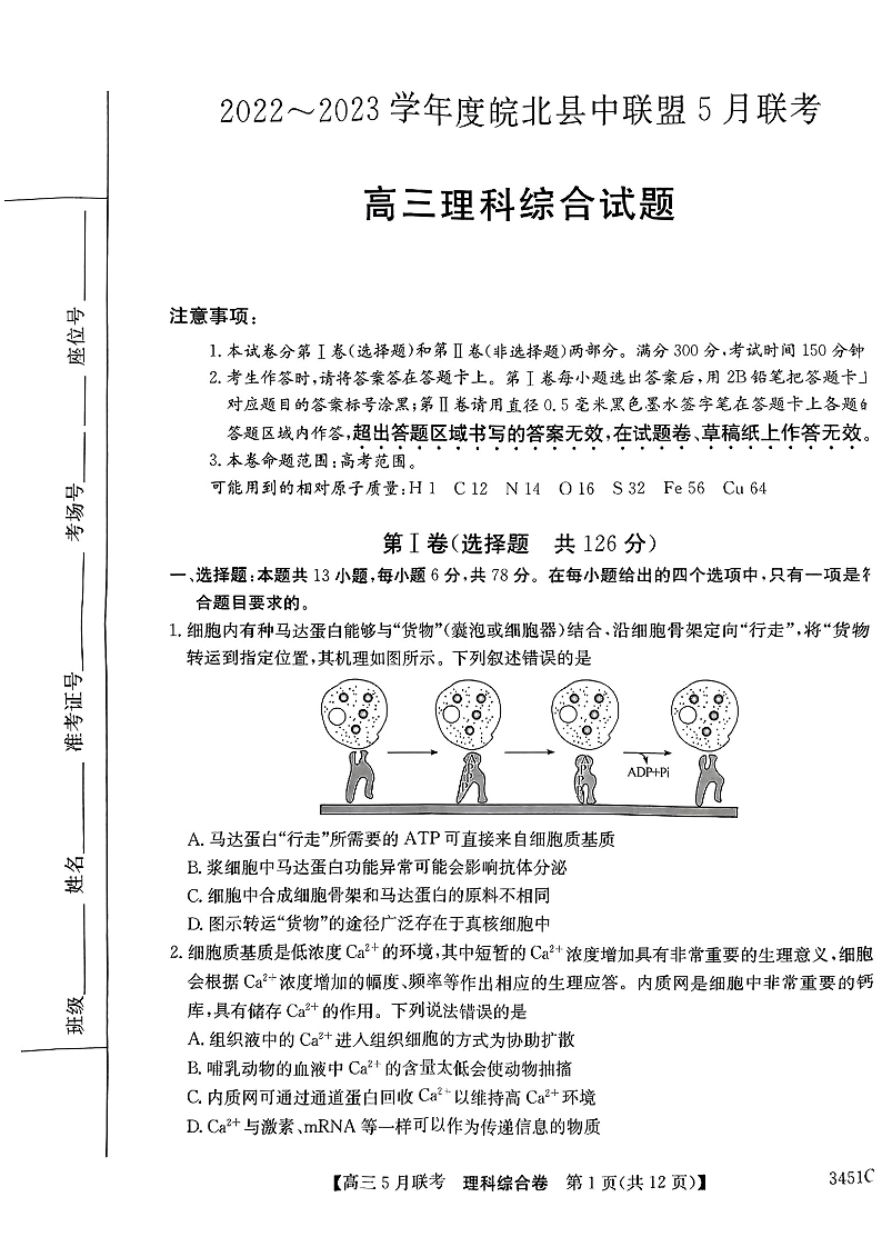 安徽省2022-2023学年度皖北县中联盟5月联考 理综