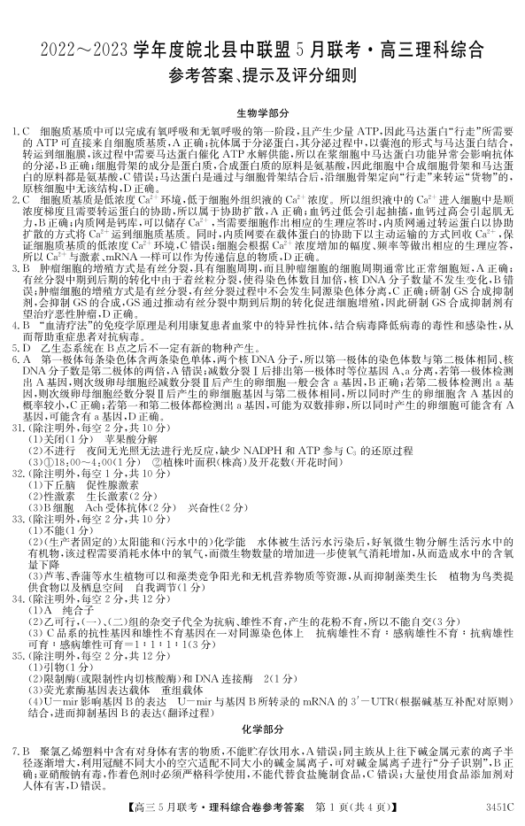 安徽省2022-2023学年度皖北县中联盟5月联考 理综答案