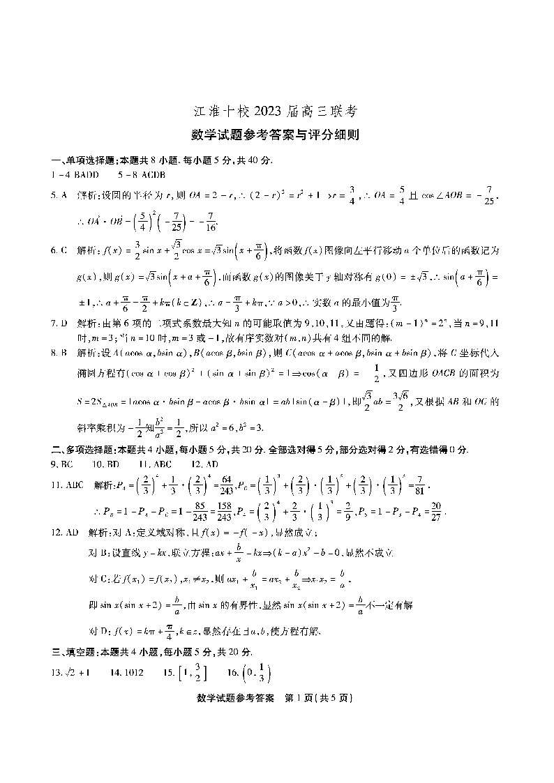 2023届安徽省江淮十校高三第四次联考 数学答案