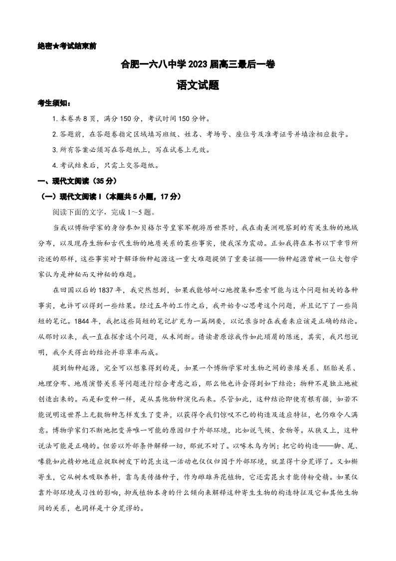 2023届安徽省合肥市一六八中学高三最后一卷 语文