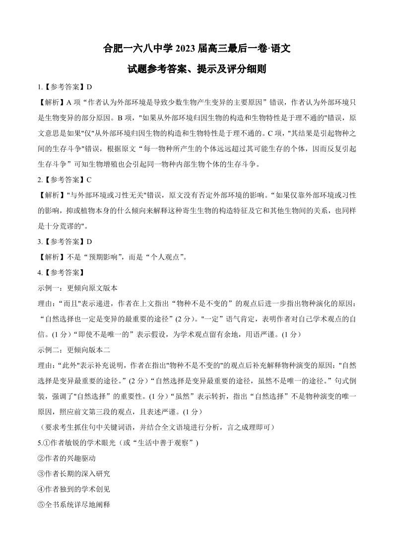 2023届安徽省合肥市一六八中学高三最后一卷 语文答案