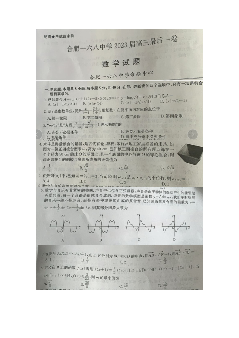 2023届安徽省合肥市一六八中学高三最后一卷 数学