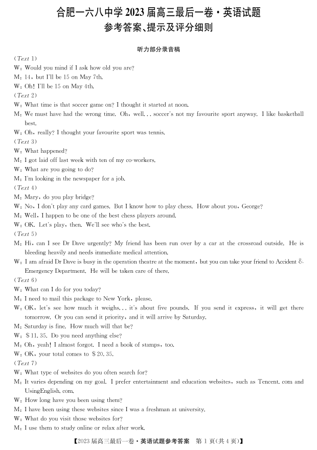 2023届安徽省合肥市一六八中学高三最后一卷 英语答案