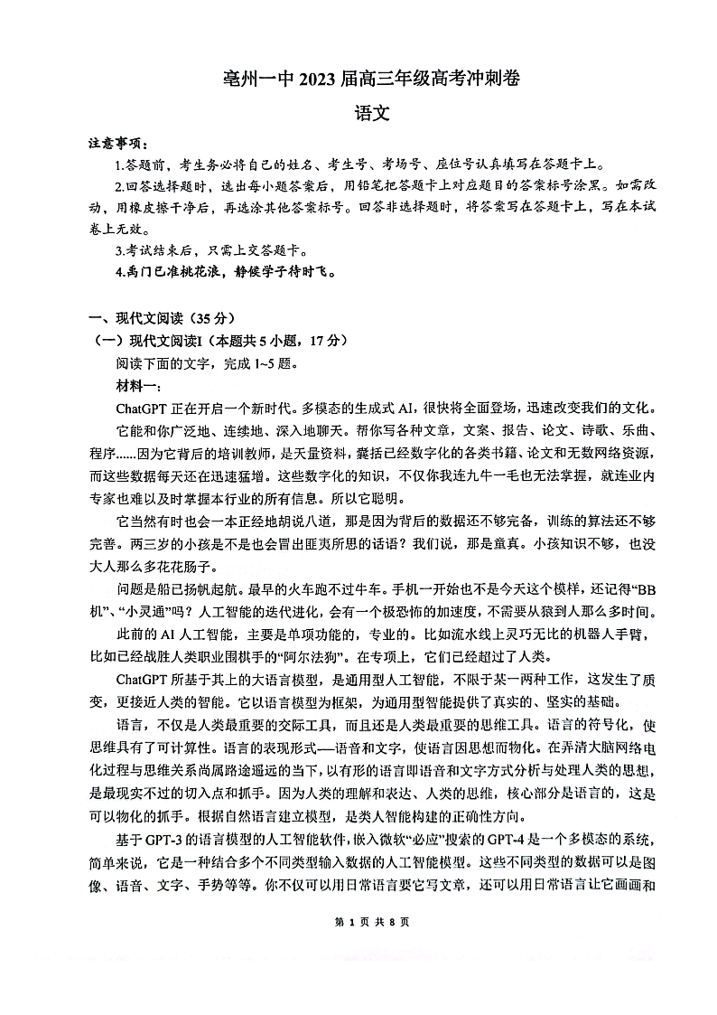 2023届安徽省亳州市第一中学高三冲刺卷 语文