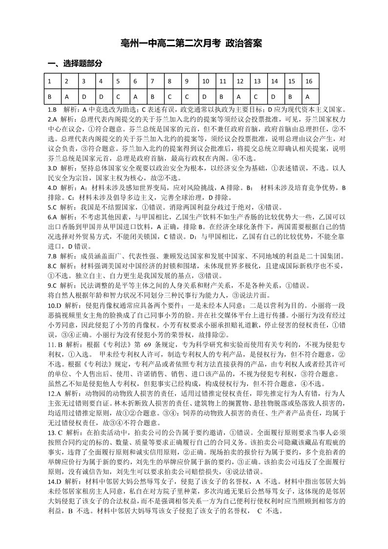 2023届安徽省亳州市第一中学高三冲刺卷 文综政治答案