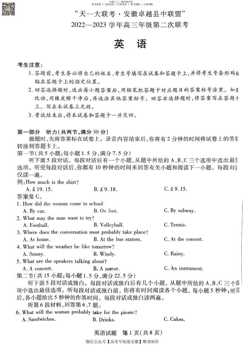 2023安徽卓越县中联盟第二次联考 英语