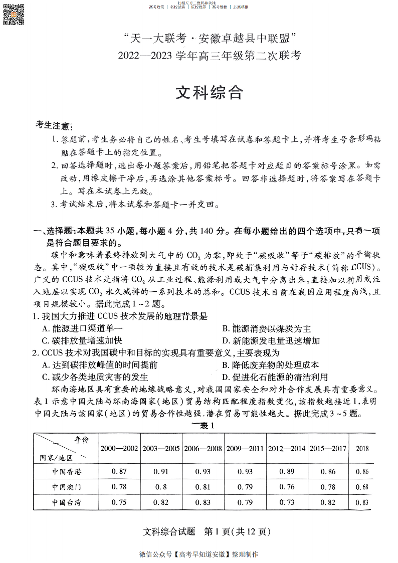 2023安徽卓越县中联盟第二次联考 文综