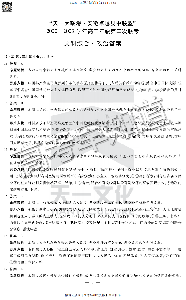 2023安徽卓越县中联盟第二次联考 文综政治答案