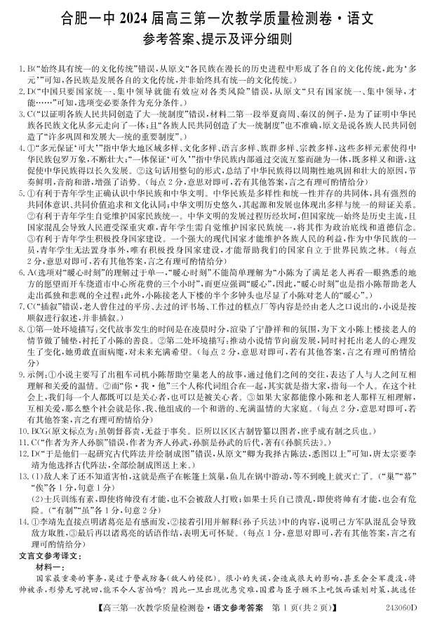 安徽省合肥市第一中学2023-2024学年高三上学期第一次教学质量检测 语文答案