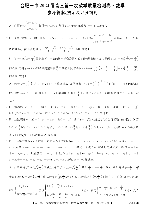 安徽省合肥市第一中学2023-2024学年高三上学期第一次教学质量检测 数学答案