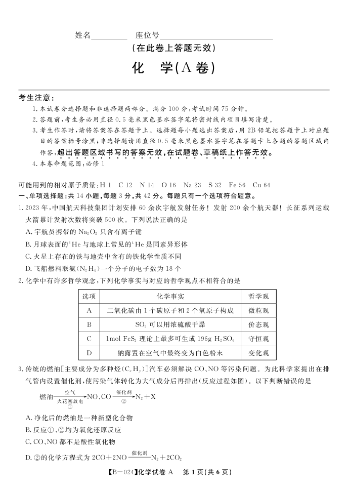 安徽皖江名校联盟2024届高三上学期10月阶段考试 化学A