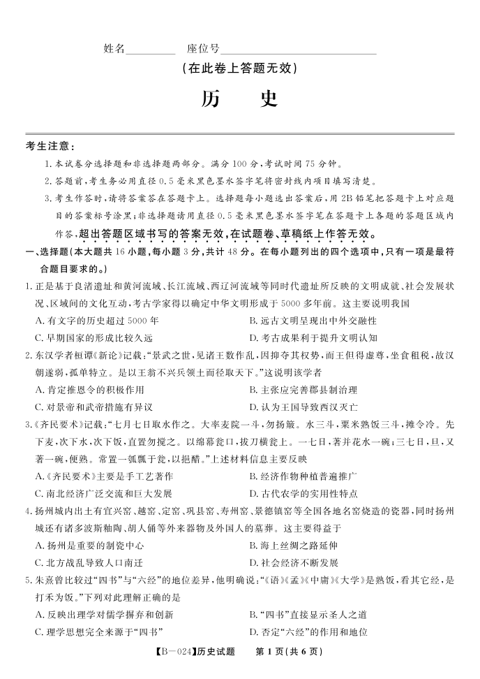 安徽皖江名校联盟2024届高三上学期10月阶段考试 历史