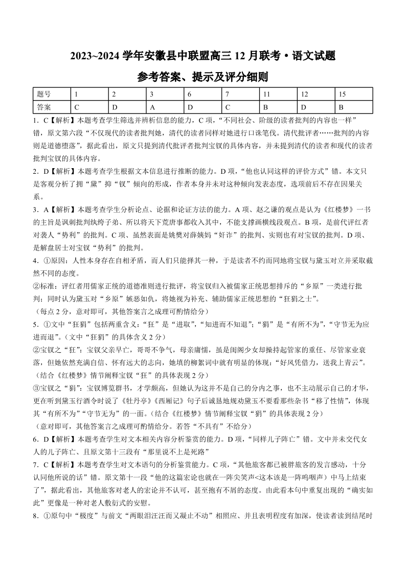 安徽省县中联盟2023-2024学年高三上学期12月联考 语文答案