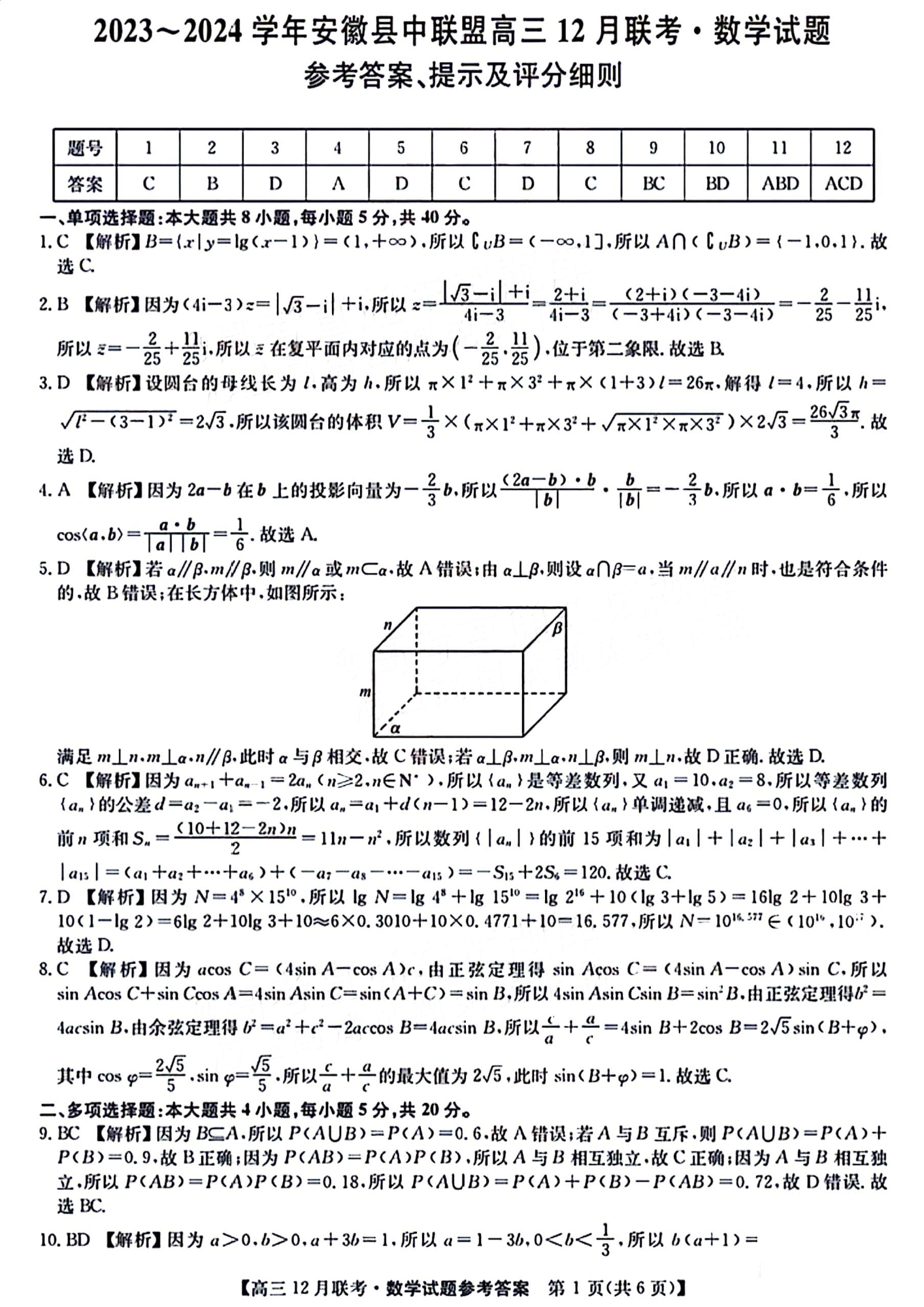 安徽省县中联盟2023-2024学年高三上学期12月联考 数学答案