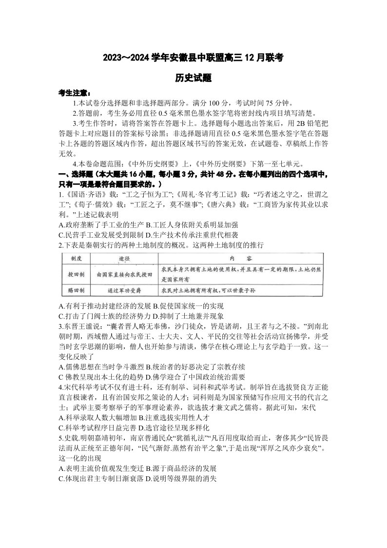 安徽省县中联盟2023-2024学年高三上学期12月联考 历史