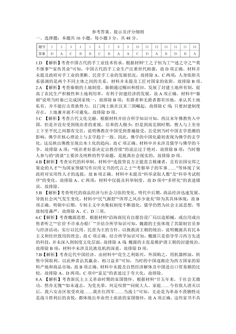 安徽省县中联盟2023-2024学年高三上学期12月联考 历史答案