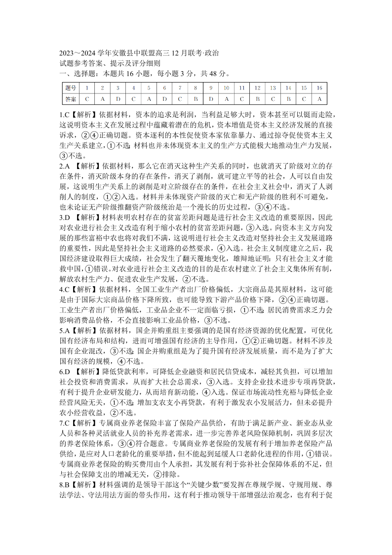 安徽省县中联盟2023-2024学年高三上学期12月联考 政治答案