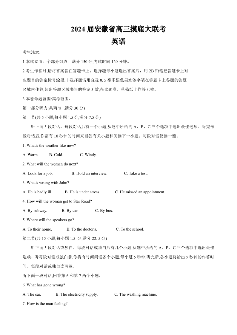 安徽省皖南八校2024届高三上学期8月摸底大联考 英语