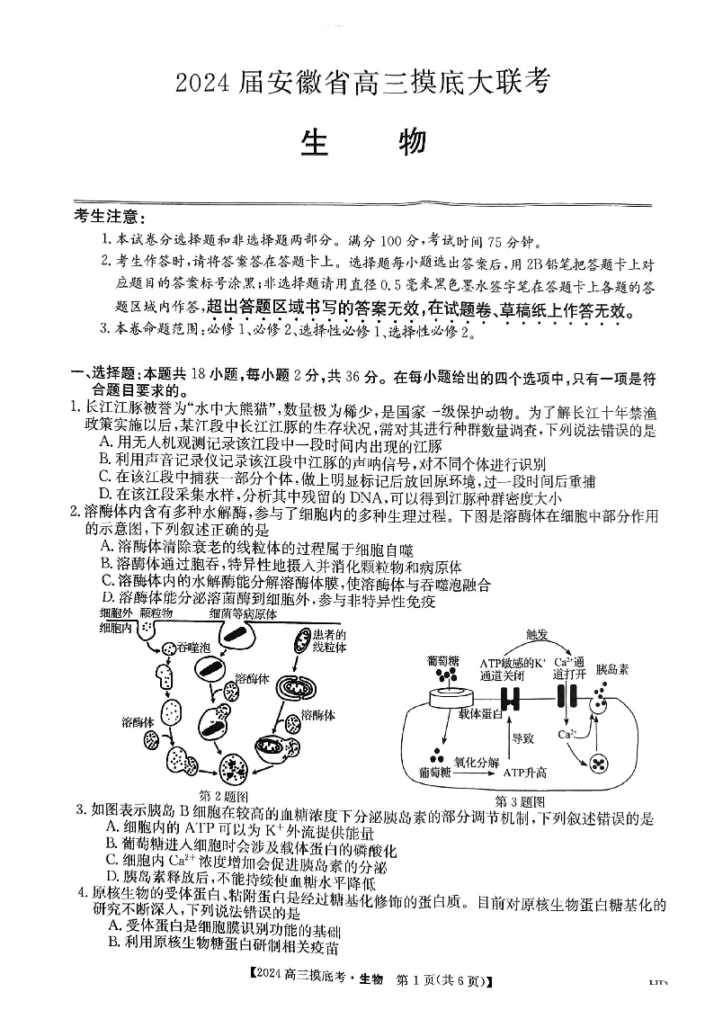 安徽省皖南八校2024届高三上学期8月摸底大联考 生物