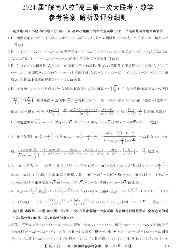 安徽省皖南八校2023-2024学年高三上学期第一次大联考 数学答案