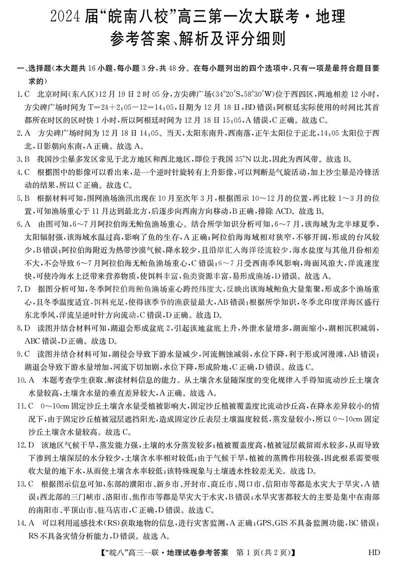 安徽省皖南八校2023-2024学年高三上学期第一次大联考 地理答案