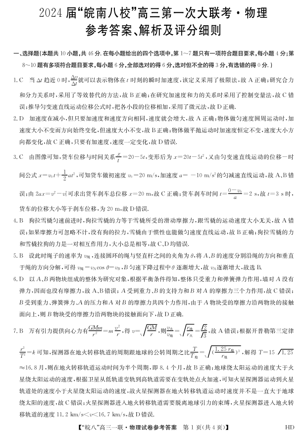 安徽省皖南八校2023-2024学年高三上学期第一次大联考 物理答案