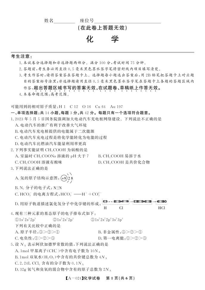 安徽省皖江名校联盟2024届高三开学摸底考试 化学