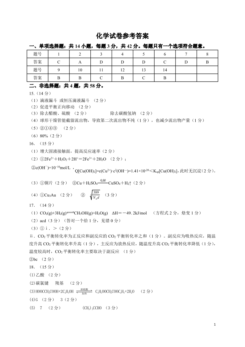 安徽省皖江名校联盟2024届高三开学摸底考试 化学答案