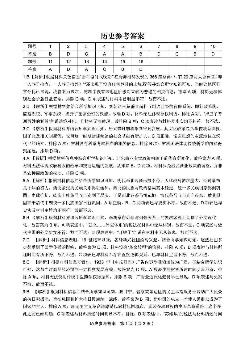 安徽省皖江名校联盟2024届高三开学摸底考试 历史答案