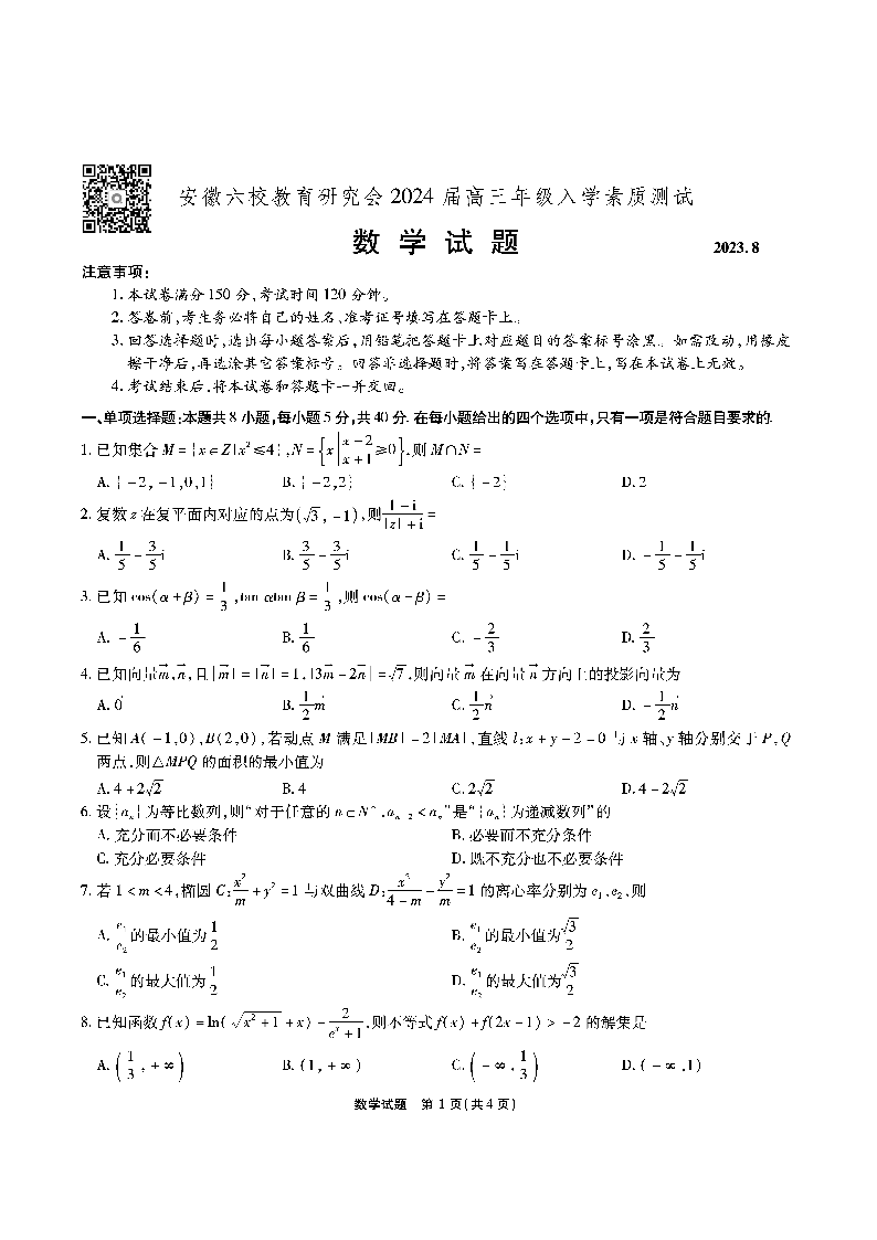 安徽省六校教育研究会2024届高三入学考试 数学