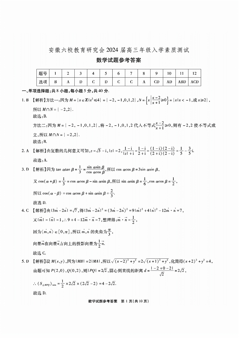安徽省六校教育研究会2024届高三入学考试 数学参考答案
