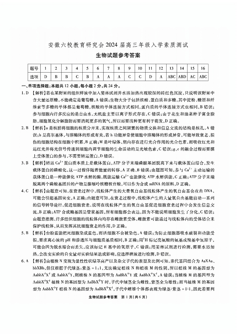 安徽省六校教育研究会2024届高三入学考试 生物参考答案