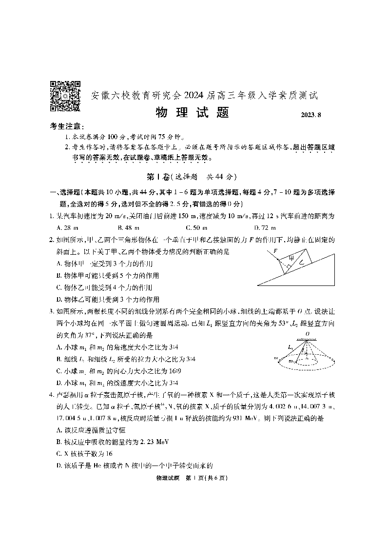 安徽省六校教育研究会2024届高三入学考试 物理