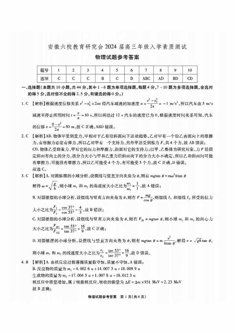 安徽省六校教育研究会2024届高三入学考试 物理参考答案