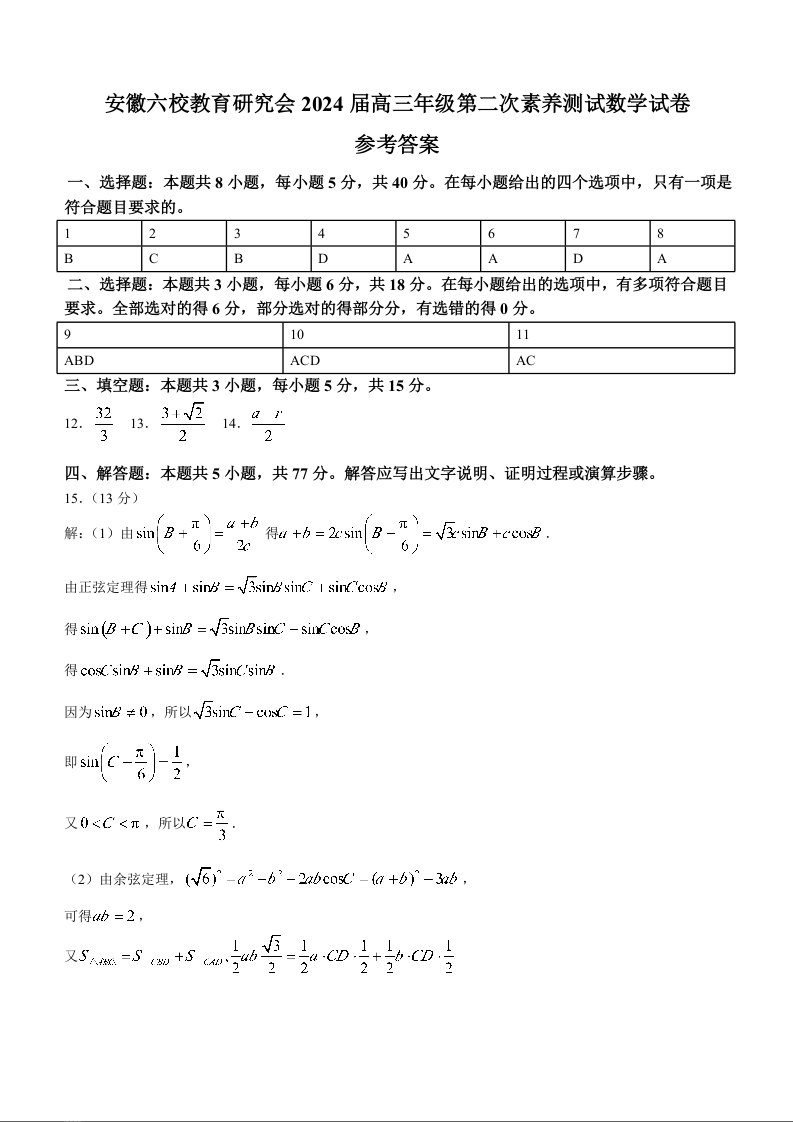 安徽省六校教育研究会2023-2024学年高三下学期下学期第二次素养测试(2月)数学答案